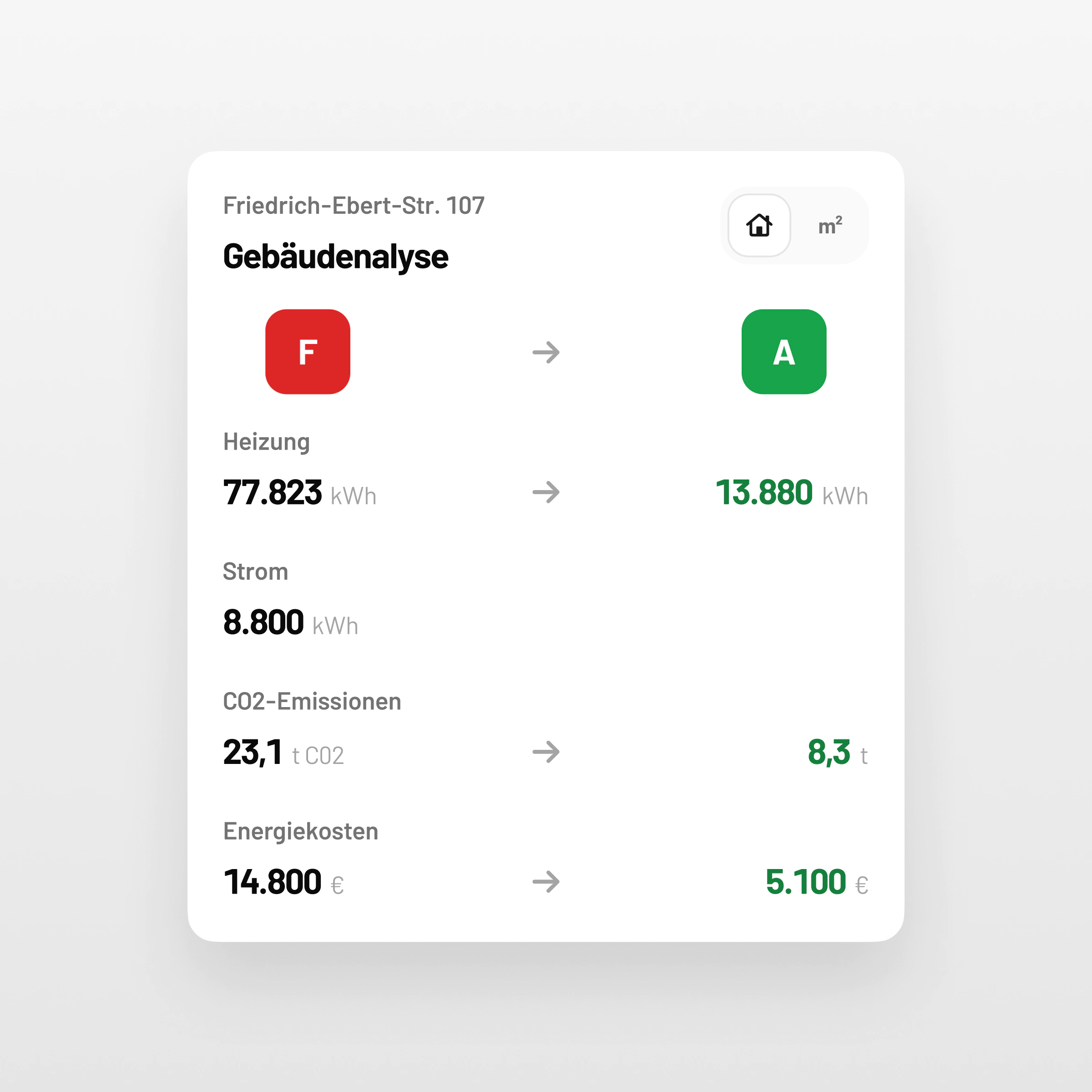Die Gebäudeanalyse vermittelt dir ein präzises Bild über den energetischen Gesamtzustand einer Immobilie. Mit den Angaben, die du bei der initialen Analyse gemacht hast, kannst du bei viadukt die Auswirkungen geplanter Sanierungsmaßnahmen sofort erkennen. Simuliere verschiedene Modernisierungsmaßnahmen wie Heizungstausch, Dämmmaßnahmen oder Fenstertausch, beauftrage eine Energieberatung oder nimm eine Finanzierungsberatung in Anspruch: Alle Maßnahmenauswirkungen basieren auf deiner Gebäudeanalyse und sind so immer präzise, individuell und keine allgemeinen Schätzwerte.